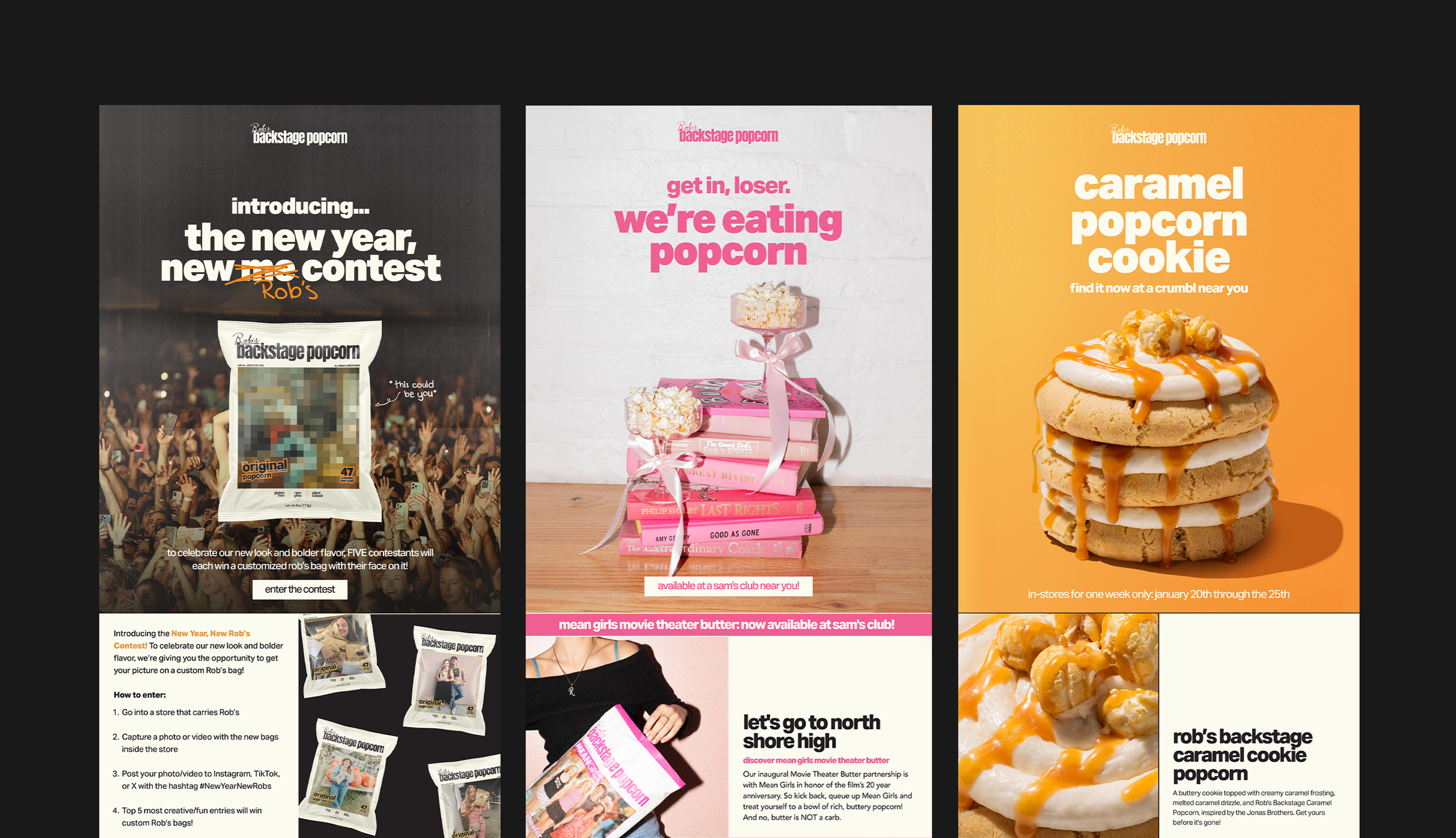 Rob’s Backstage blends tradition with innovation, evolving from a backstage favorite into a shared indulgence. When I joined, it was sold only on Jonas Brothers tours. With the team, we built its online presence, launched collaborations with Kelly Clarkson, Kygo, Priyanka Chopra Jonas, and Paramount’s Mean Girls, and expanded into stores nationwide. In 2024, I led the design rebrand, overhauling the packaging, website, and visual identity to bring Rob’s magic to a much larger audience.